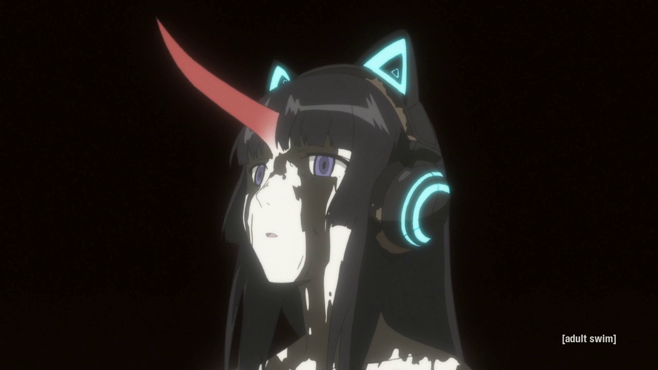 "There is nothing I want to be. There is nothing I want to do. All that exists is zero." Hidomi dreams of an apocalyptic landscape where her body is rotting and strange entities (the shape of a flat iron) are trying to attack her. Her body transforms into a giant mecha but as she prepares to fight them off, she wakes up. On her way down for breakfast, her mom cheerfully greets her by pointing a knife at her throat and insisting that she say 'good morning.' Hidomi makes no response whatsoever and her mom dismisses the attitude as simply her "tsundere" persona.